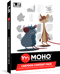 カートゥーンコンテンツパックは、Charles Kenway氏がMohoで作成した、プロフェッショナルなデザインのコンテンツです。カートゥーンコンテンツパックには、スマートボーンやフレームバイフレームアニメーションなど、Moho独自のアニメーション機能を活用するための、フルリギングされたキャラクターとボーン付きのサンプルシーンが含まれています。また、リアルな描画やペイントをシミュレートするブラシ、散布ブラシ、スウォッチ、エフェクト、プロップ、スタイルも含まれています。