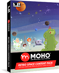 レトロスペース コンテンツパックは、Charles Kenway 氏が Moho で作成した、プロフェッショナルなデザインのコンテンツです。レトロスペース コンテンツパックには、スマートボーンやフレームバイフレームアニメーションといった Moho 独自のアニメーション機能を活用するための、フルリグのキャラクターとボーン付きのサンプルシーンが含まれています。また、リアルな描画やペイントをシミュレートするブラシ、散布ブラシ、スウォッチ、エフェクト、プロップ、スタイルも含まれています。