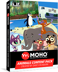 Moho内でプロフェッショナルにデザインされたAnimalsコンテンツパックは、スマートボーンを含むMoho独自のアニメーション機能を最大限に活用できるよう、リギングとアニメーションが完全に組み込まれています。このコンテンツパックでは、Moho独自のアニメーション機能、リギング、スマートボーン、シーン設定など、Mohoの多くの独自機能を体験できます。
